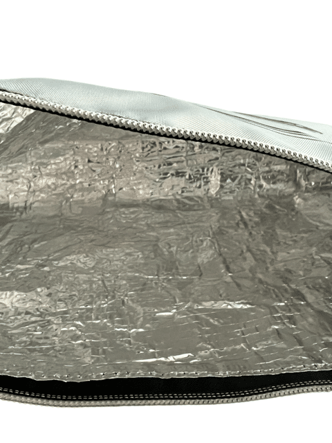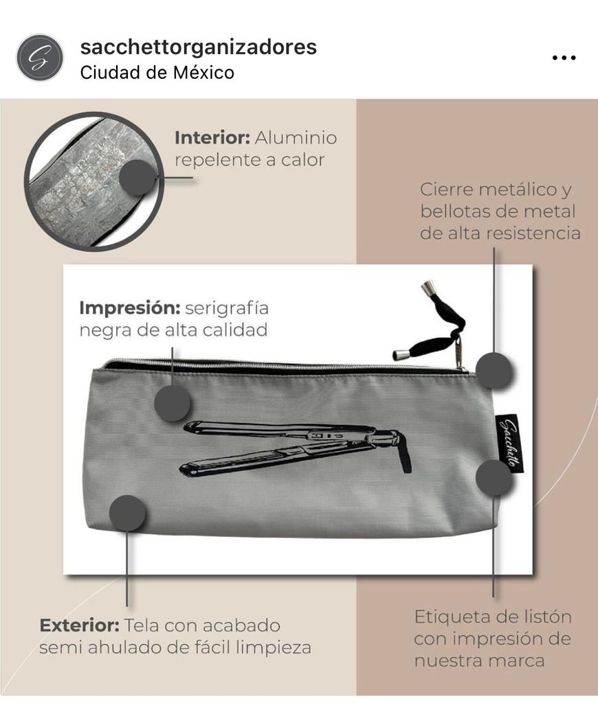 ¡Esta sacca es especial!, tiene un material resistente y lavable por fuera. En el interior cuenta una recubrimiento de aluminio color plateado que te ayuda a aislar el calor de la plancha al usarse para que la puedas guardar aún caliente de una forma segura.